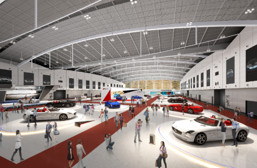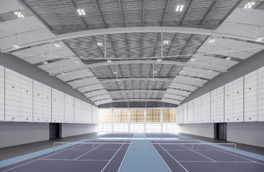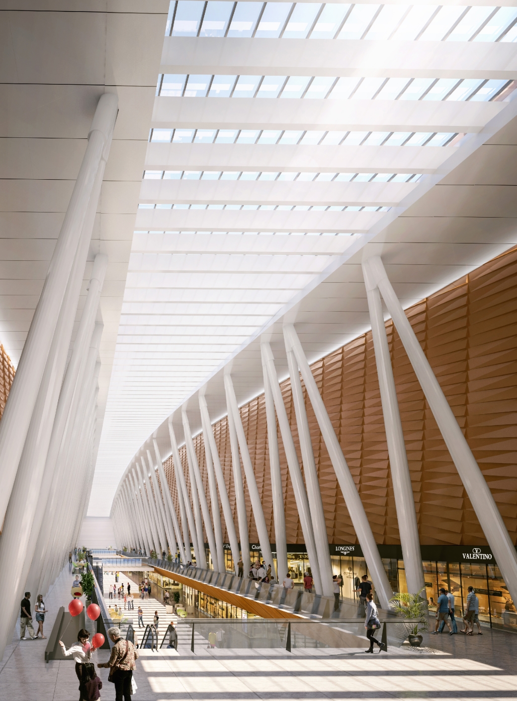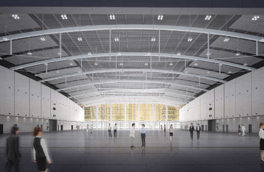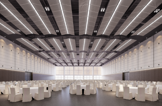 明亮舒适的展示交易及文化活动中心内部以一层大厅及通高的中庭联系空间,天光自狭长的天窗倾落,在双排巨型廊柱之间形成独特的光影。